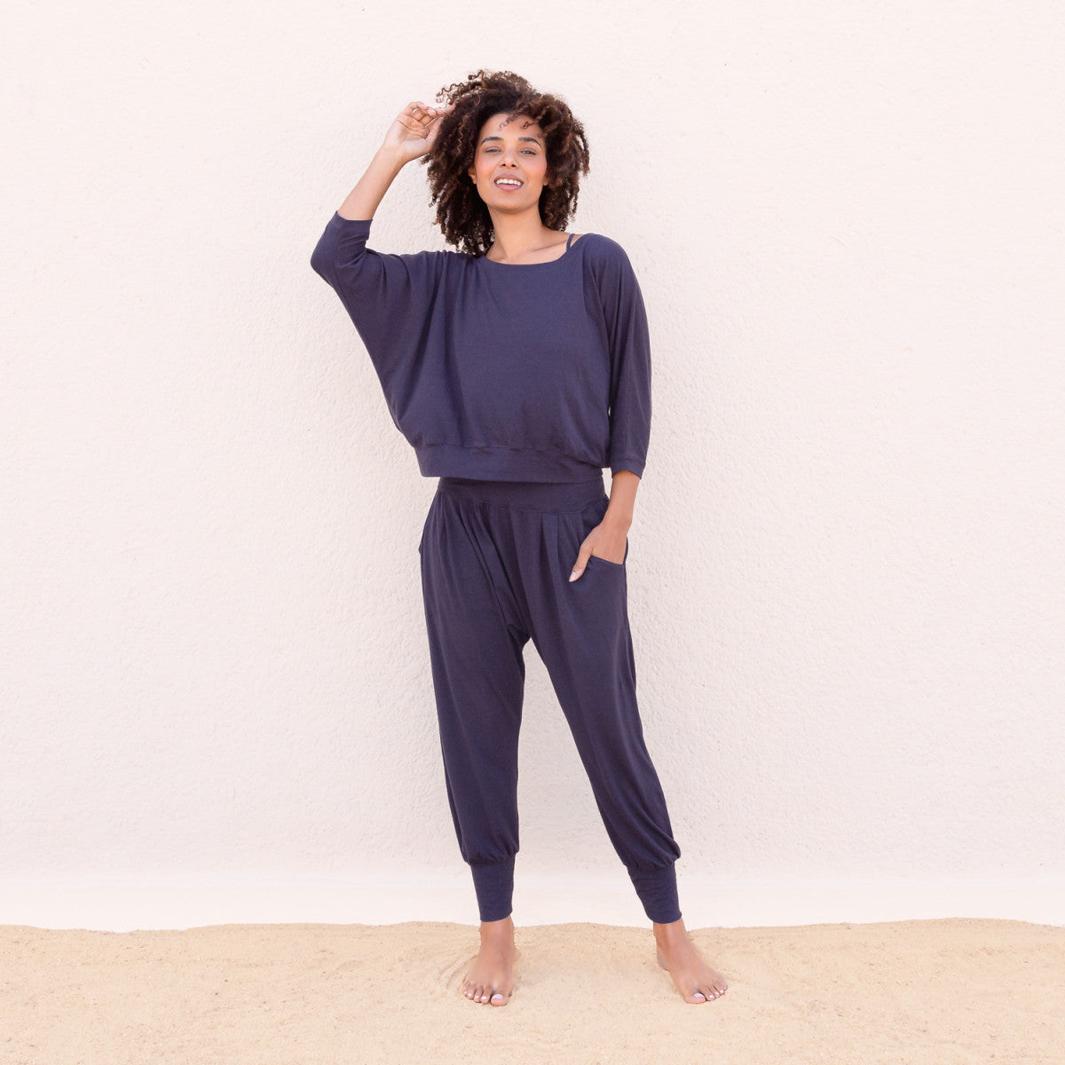 De Megan duurzame yoga harembroek is ontworpen voor momenten waarop comfort en bewegingsvrijheid centraal staan. De relaxte pasvorm geeft je alle ruimte tijdens je yogapractice, maar zit ook heerlijk tijdens een rustige avond thuis. De dames yogabroek beweegt soepel met je mee en past zich moeiteloos aan jouw dag aan.