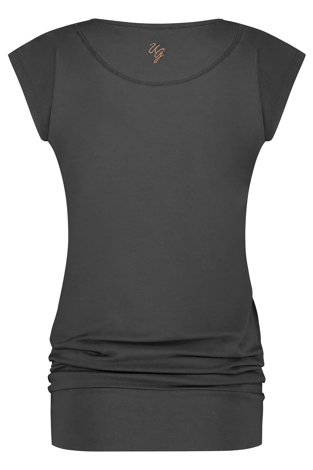 De Asna Bamboe Yoga Tee van Urban Goddess is duurzaam, dry-fit en ademend. De brede heupband houdt het dames yoga shirt op zijn plek en zorgt ervoor dat je buik en onderrug bedekt blijven. De stof reguleert je temperatuur, waardoor je fris en koel blijft.