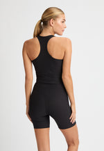 De Ribbed R tank is gemaakt van gerecycled polyester, een zachte stof met een comfortabele geribbelde structuur. Model met een nauwsluitende, korte pasvorm met flexibele racerback.