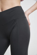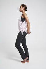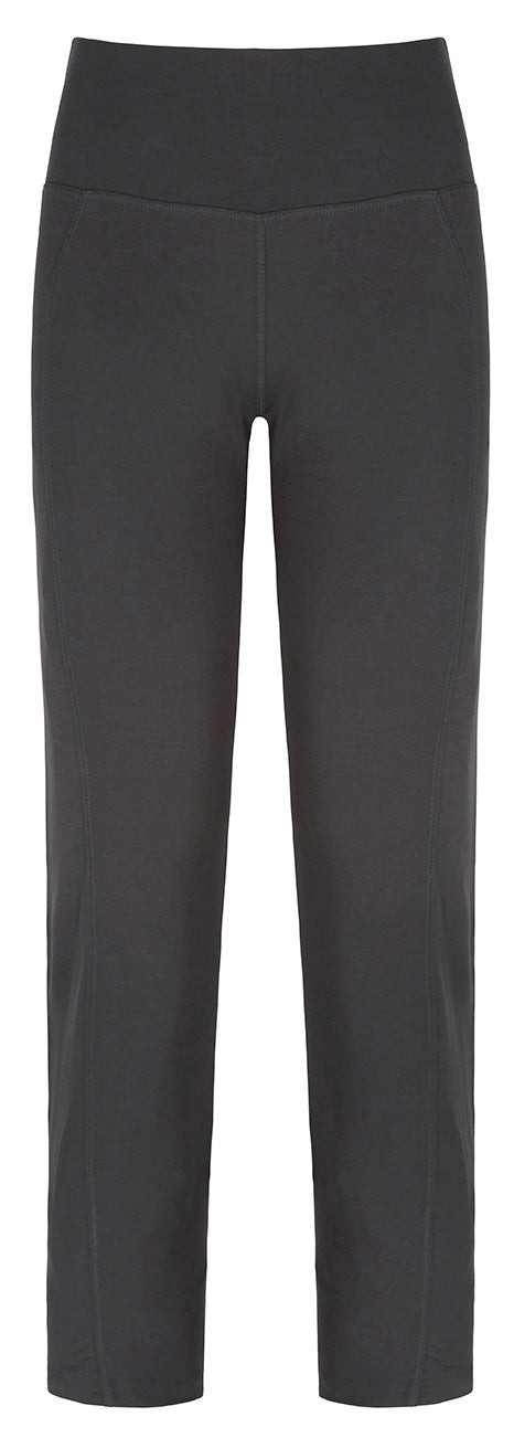 De donkere yoga broek heeft een fijne brede tailleband. Dit zorgt voor extra support bij je buik en onderrug en houdt je yoga pants ook nog eens op zijn plek. Nog een benefit van deze yoga broek is de dry-fit stof. Hierdoor blijf je langer fris en droog tijdens je yoga practice, zelfs bij dynamische yoga vormen.