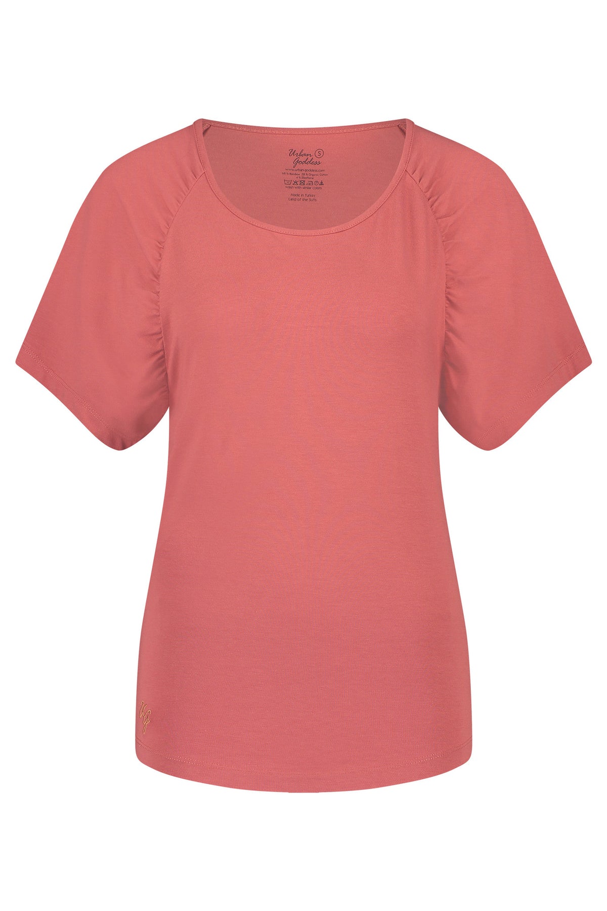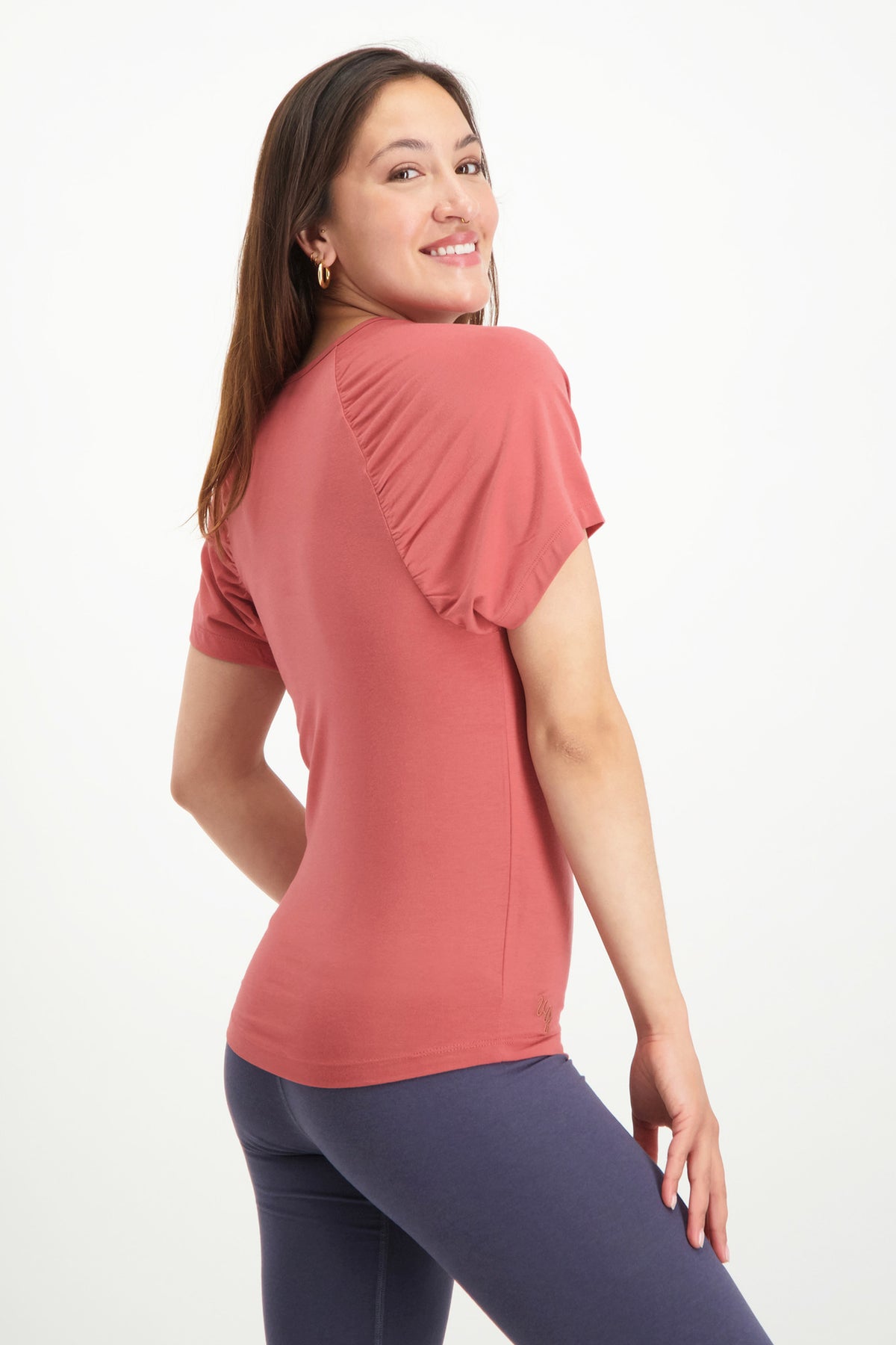 De Chandra is een nonchalante maar vrouwelijke yogatop met korte mouwen van Urban Goddess. De geplooide wijde mouwen en ruime hals zijn een vrijbrief om zorgeloos te bewegen. Door de slim-fit blijft deze top namelijk toch goed zitten. Dit is een yogashirt van bamboe en biologisch katoen. Gecertificeerd vegan, soepel én vocht-absorberend.
