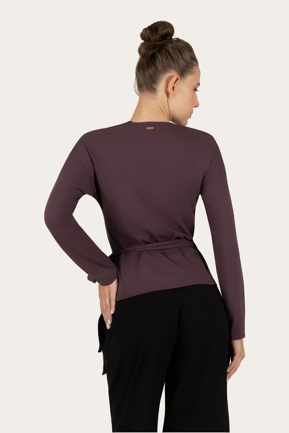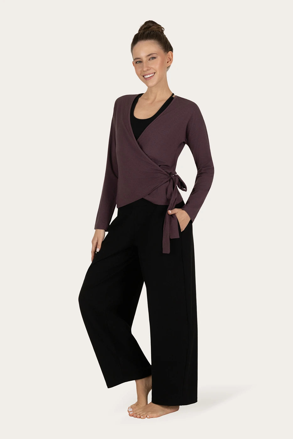 Dankzij het verstelbare wikkelmodel met strik in de taille sluit het bamboe wrap yoga vest mooi aan op jouw lichaam. De lange mouwen en de overslaghals zorgen voor een vrouwelijke en flatterende pasvorm. De natuurlijke stof is sneldrogend en antibacterieel, wat zorgt voor een fris gevoel tijdens je flow of meditatie.