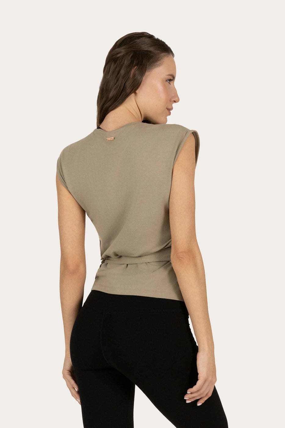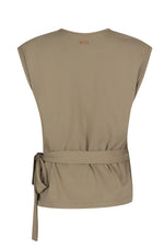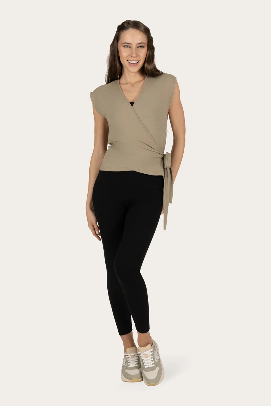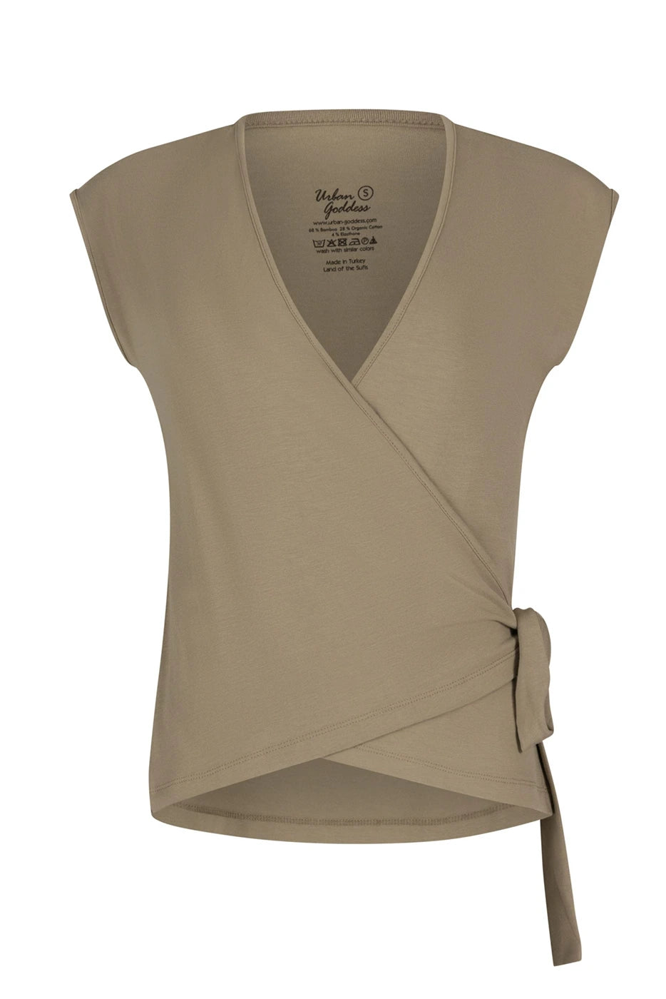 Dry-fit yoga & pilates wrap top van bamboe en biologisch katoen met verstelbare taille. Soepel, ademend en ideaal voor yoga, pilates en ontspannen momenten off the mat.