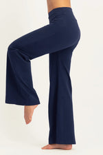 Het model is 1,72 m en draagt de Maeve wijde yogabroek met midwaist van katoen in maat S. Materiaal: 90% biologisch katoen en 10% lycra