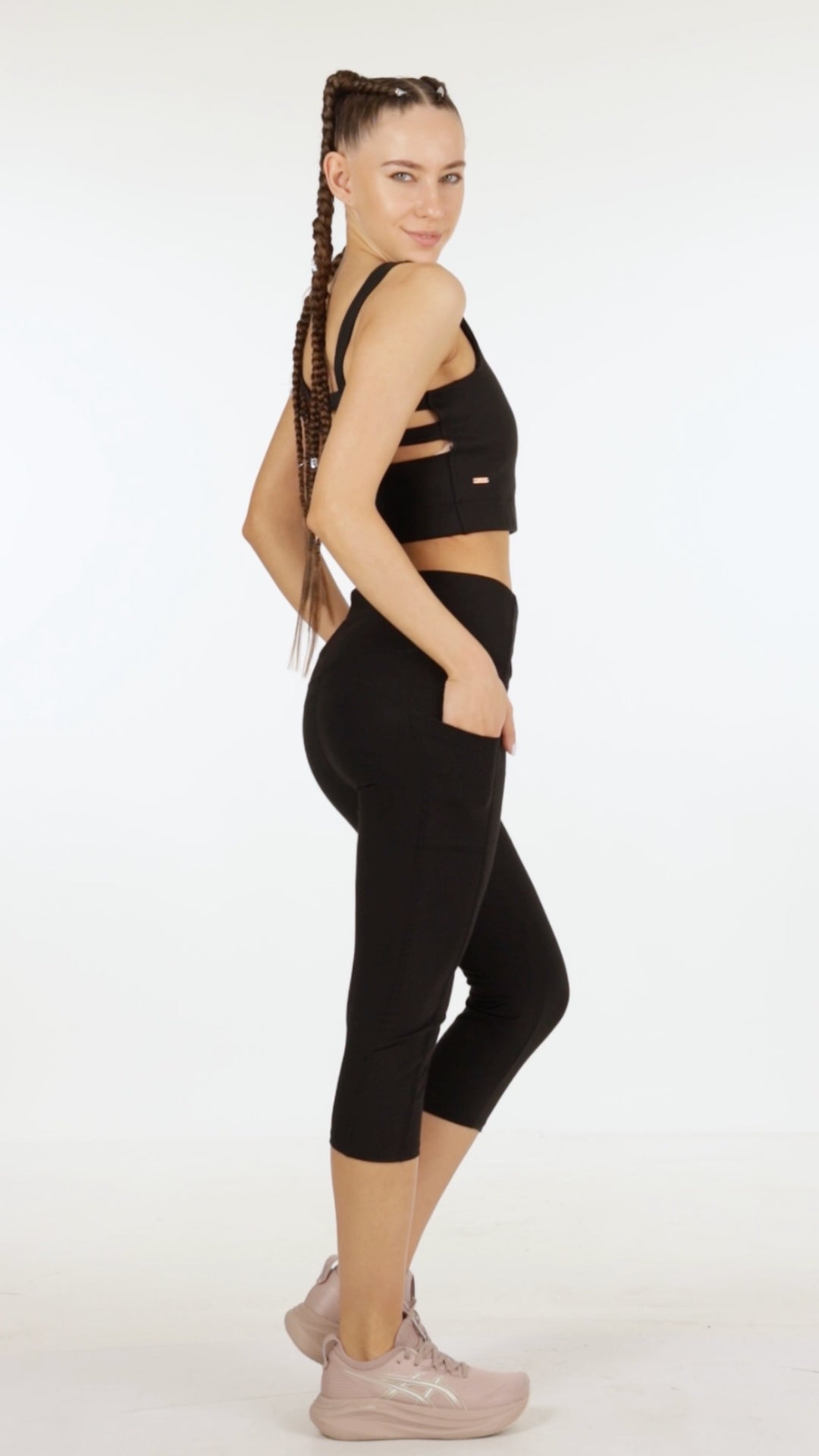 De Tara yoga capri legging is een comfortabele cropped yogalegging voor warme dagen en actieve practices. Deze zwarte capri legging heeft een aansluitende pasvorm en is gemaakt van een zachte mix van bamboe en biologisch katoen. De stof voelt licht en ademend aan en geeft tegelijk fijne support tijdens yoga, pilates of workouts.