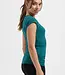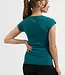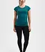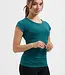 Het Zefira dames shirt heeft korte mouwen, een ronde hals en subtiele plooitjes aan de zijkanten voor een flattering fit. De plooitjes geven deze duurzame yoga tee daarnaast een extra speelse touch. De groene top valt soepel over je heupen en beweegt met je mee in elke pose.